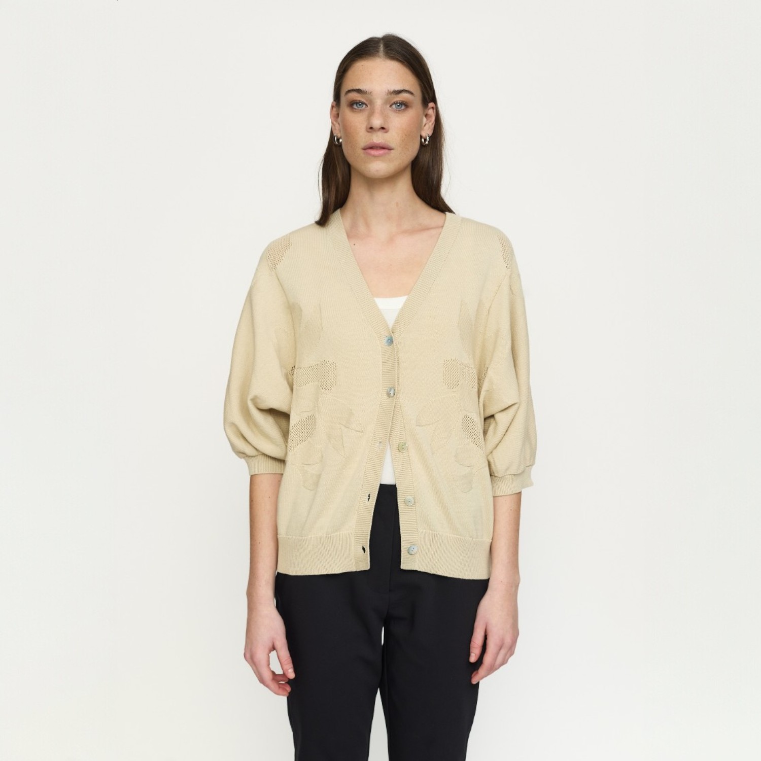 Het vest heeft een ontspannen pasvorm en voelt zacht en aangenaam aan, waardoor het ideaal is om het hele jaar door te dragen. Draag de cardigan open over een T-shirt of blouse voor een casual look, of combineer hem met een jurk of pantalon voor een meer geklede uitstraling. Een veelzijdig item dat zowel comfortabel als stijlvol is.