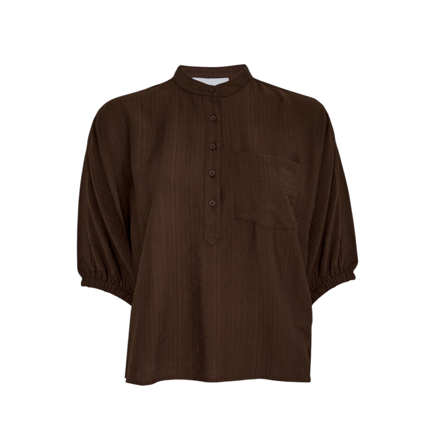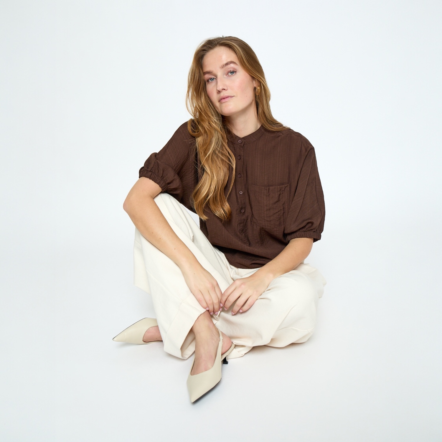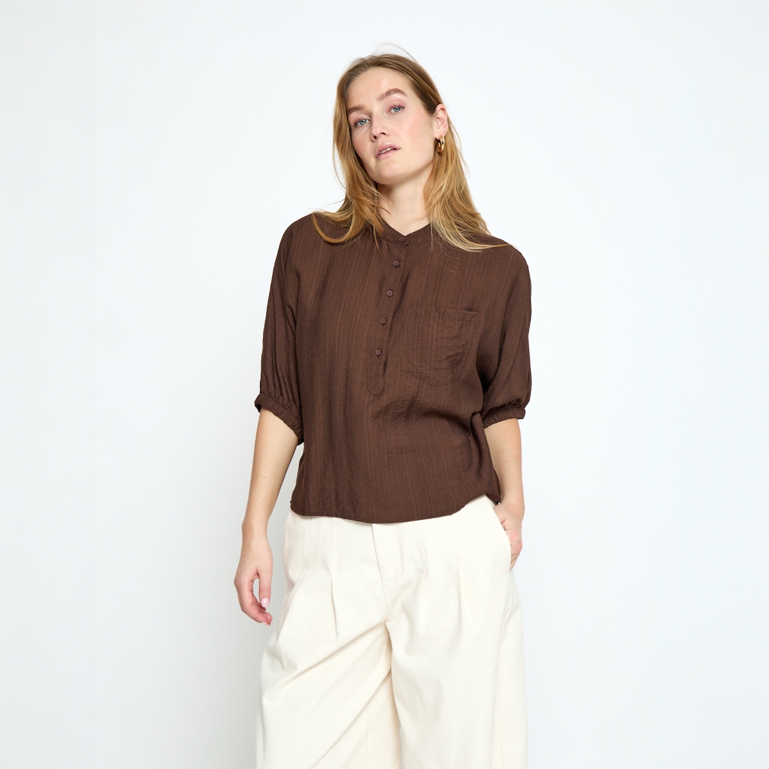 De stof voelt licht en comfortabel aan, waardoor deze blouse ideaal is voor dagelijks gebruik. Bovendien zorgen de korte, licht gepofte mouwen voor een subtiel vrouwelijk silhouet, terwijl de losse pasvorm een ontspannen en moeiteloze look creëert. De opstaande kraag en knoopsluiting geven het geheel een verfijnde, bijna Scandinavische uitstraling: ingetogen, maar met oog voor detail.