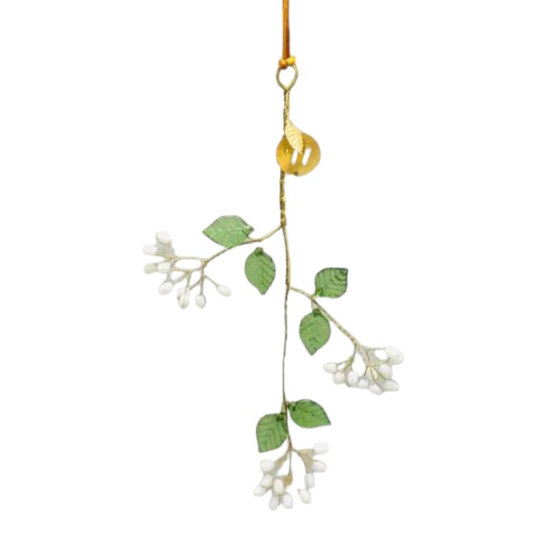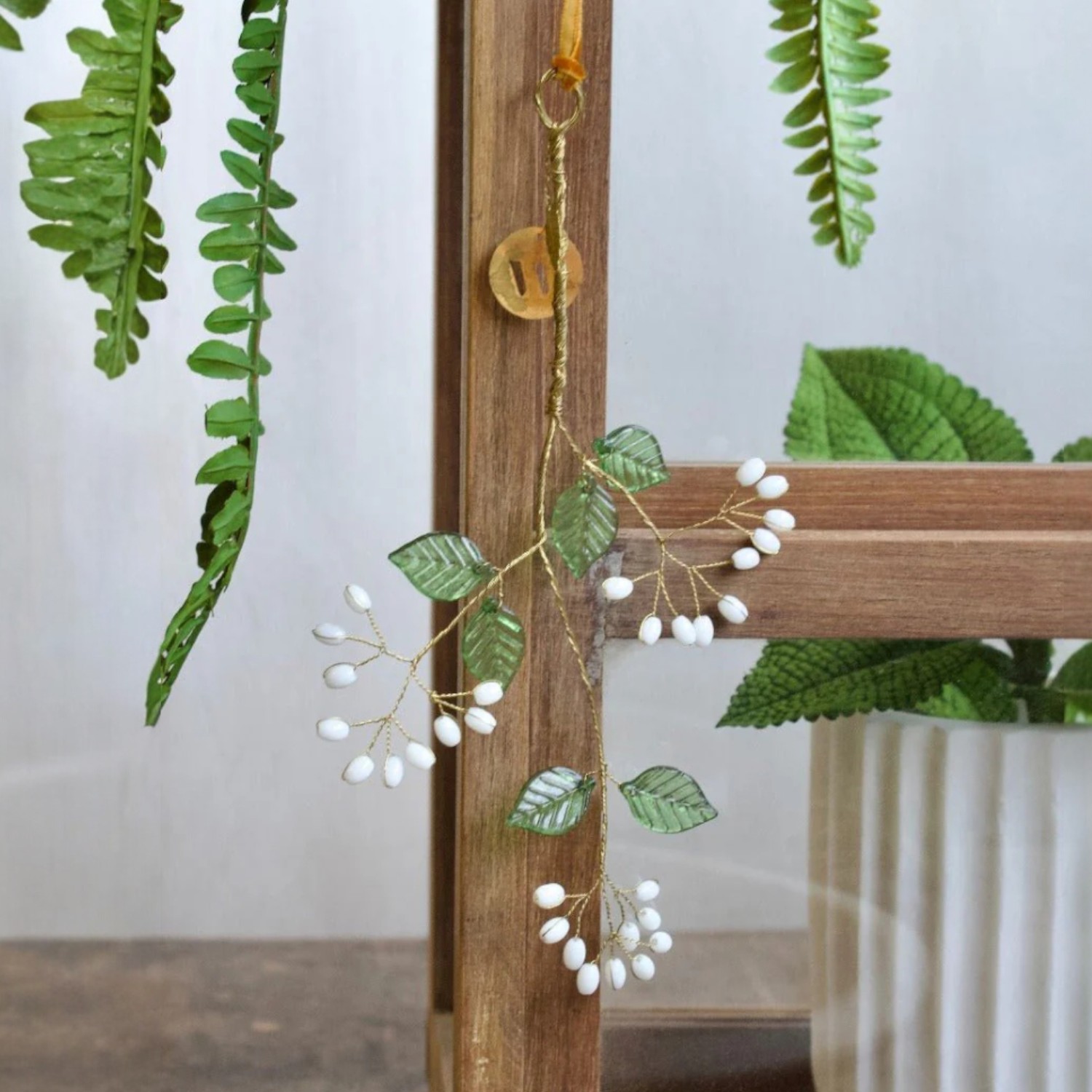 De Bloesemtak van De Weldaad is een sierlijke botanische decoratie met verfijnde details. De tak bestaat uit handgevormde groene bladeren en clusters van matte witte kralen, die elegant met de hand zijn geregen. Het subtiele samenspel van materialen geeft dit stuk een unieke en ambachtelijke uitstraling.