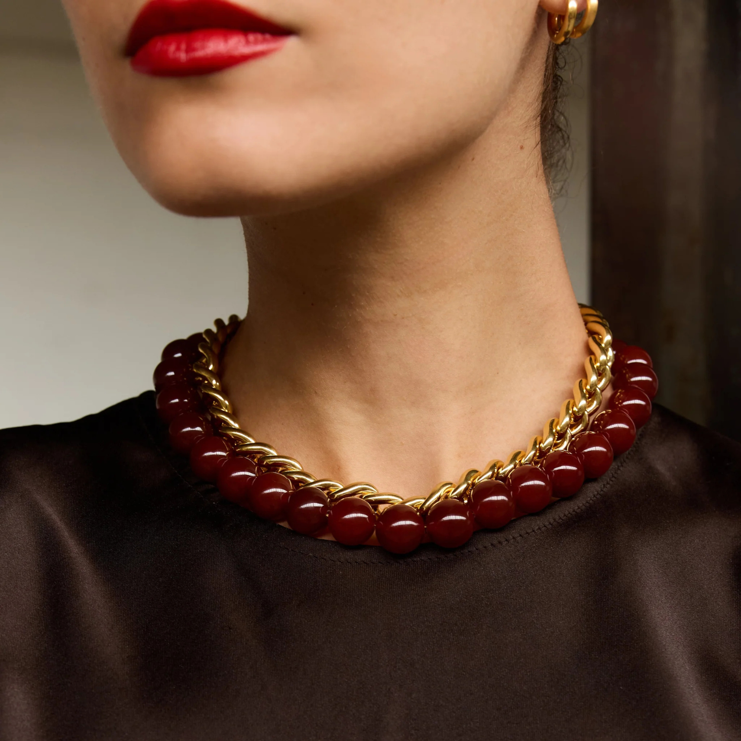 Boule necklace red cornelian is een krachtige, elegante ketting van Adorn die direct warmte en diepte toevoegt aan je look. De ronde kralen van rode cornelian hebben een diepe, glanzende kleur, waardoor de ketting een rijke, bijna fluwelige uitstraling krijgt. Daardoor is dit sieraad ideaal voor wie zoekt naar een accessoire dat zowel klassiek als modern aanvoelt.