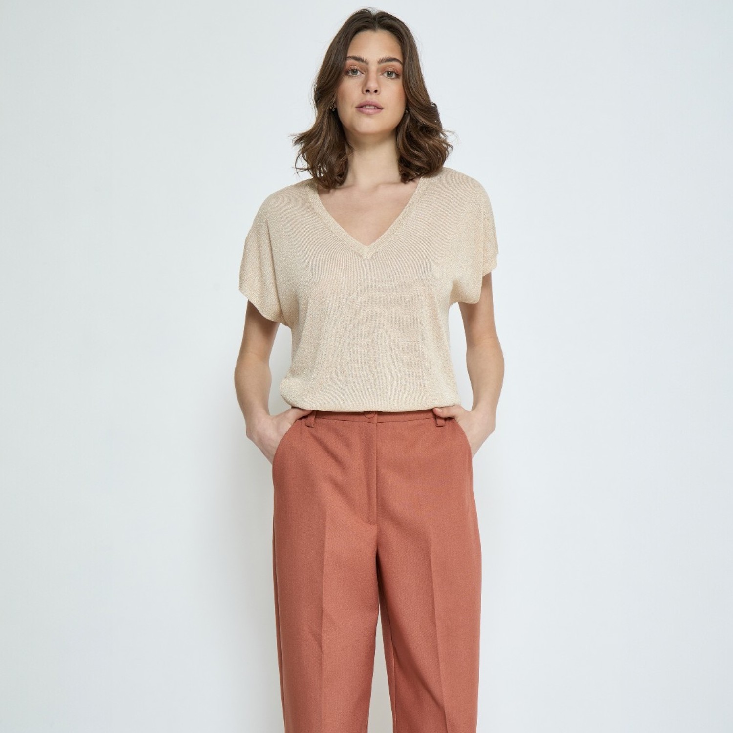 Deze metallic knit top is perfect om een eenvoudige outfit extra uitstraling te geven. Combineer de Carlina Batsleeve Knit Tee met een jeans of pantalon voor een casual chic look of draag hem met een rok voor een meer geklede styling. Voor een mooie set kun je deze top combineren met een zwarte of donkergrijze broek voor een stijlvolle, rustige outfit. De metallic finish maakt deze top geschikt voor zowel overdag als in de avond.