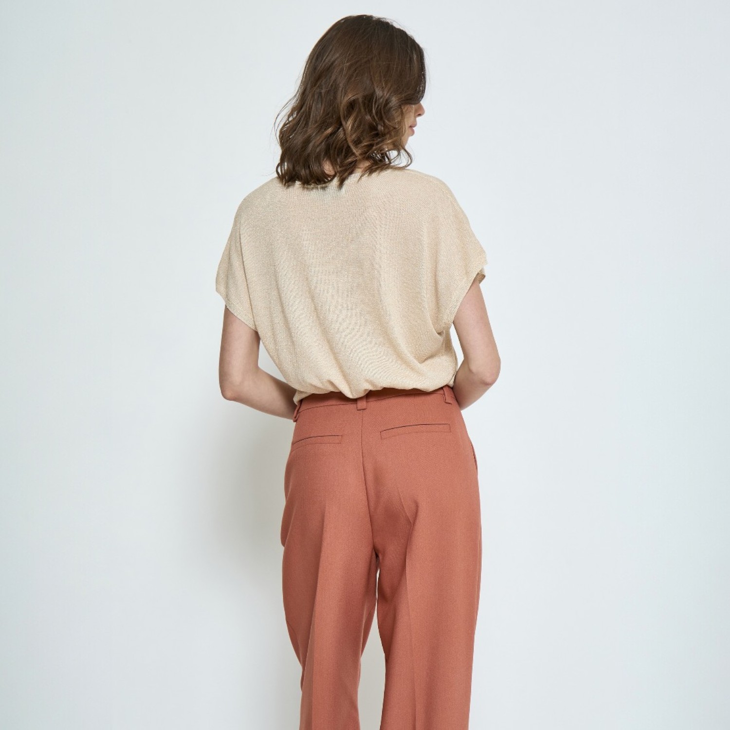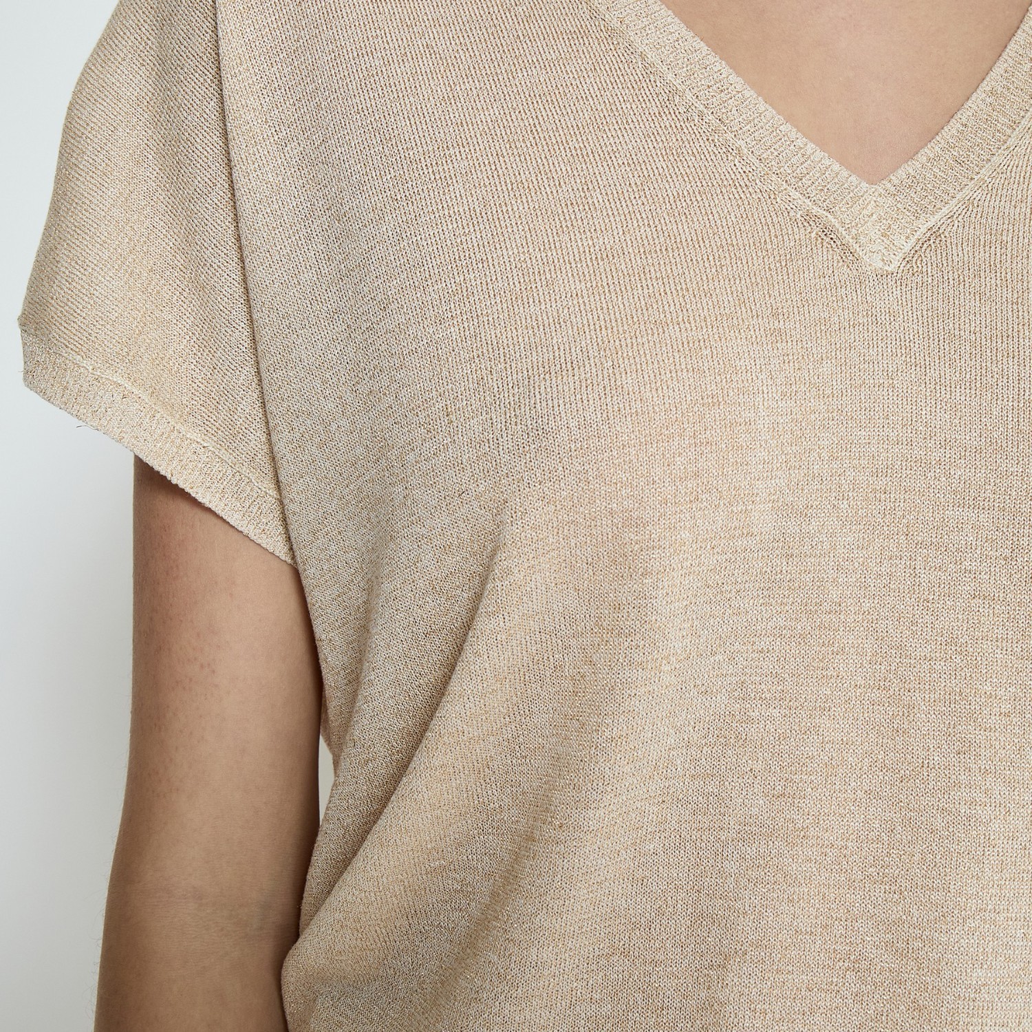 De Carlina Batsleeve Knit Tee Metallic Medal Gold van Minus is een elegante zwarte dames top met een subtiele metallic glans en korte batsleeve mouwen. De zachte knitkwaliteit voelt comfortabel aan op de huid en geeft de top een verfijnde, moderne uitstraling. De wijde mouwen zorgen voor een speels silhouet en maken dit item net even anders dan een klassieke knit tee.