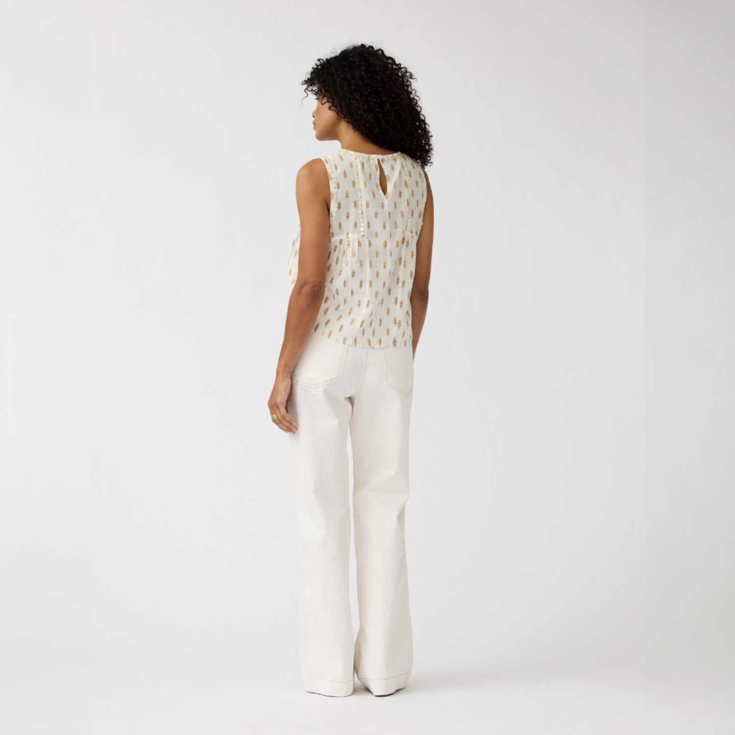 De Chloe Top Off White van Alchemist is een mouwloos, minimalistisch statement-stuk dat luxe uitstraalt. Het lichte en luchtige materiaal zorgt voor een comfortabele pasvorm, terwijl het subtiele goudkleurige printje en de verfijnde parelmoer knoopdetails een elegant en verfijnd accent geven. De A-lijn en ronde hals maken het een zomers en veelzijdig item dat moeiteloos te combineren is met verschillende outfits.