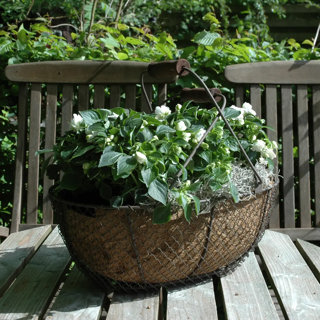 Deze bruine draadmand is ideaal voor het verzamelen van groenten, fruit, bloemen of als plantenpot. Dankzij de stevige houten handgrepen is de mand eenvoudig te verplaatsen en geschikt voor gebruik in de tuin, op het terras of in de kas. Een handige en decoratieve oplossing voor wie graag georganiseerd te werk gaat in de tuin.