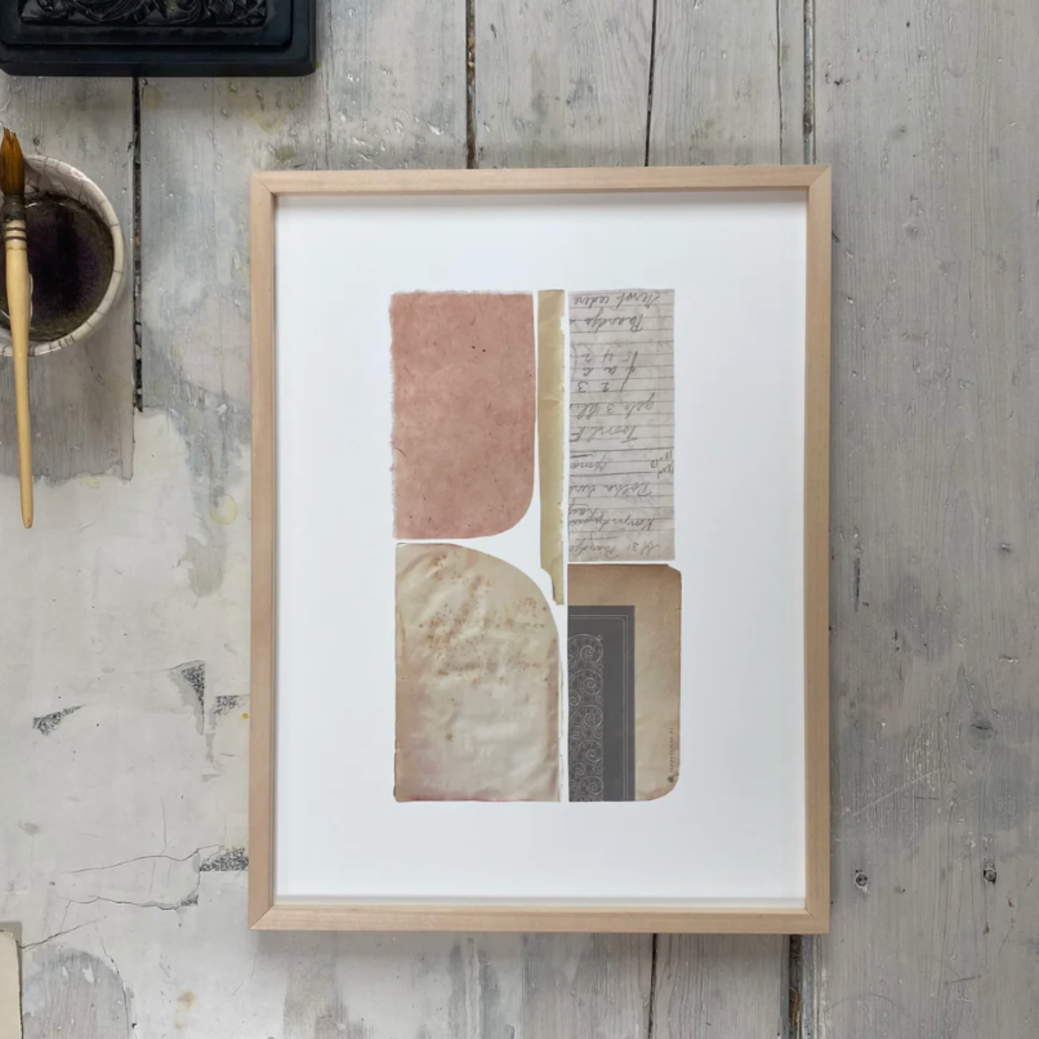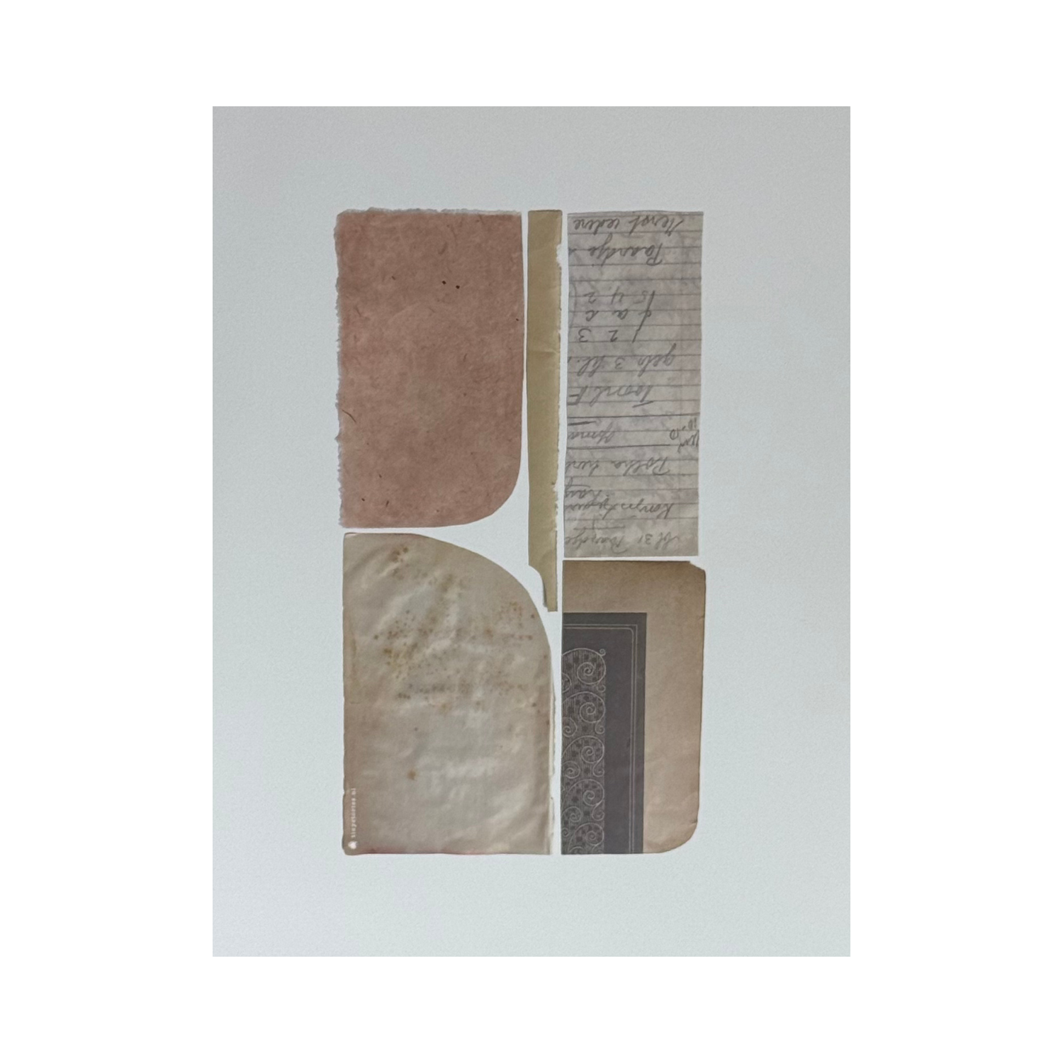 Deze kunstprint van Tinystories bestaat uit een collage van zachte, vintage ogende papierelementen in neutrale tinten. De combinatie van handgeschreven notities, afgeronde vormen en verweerde structuren geeft het werk een gelaagd en bijna tastbaar karakter. De print is rustig en minimalistisch, maar door de verschillende texturen ontstaat er toch diepte en subtiliteit in de compositie.