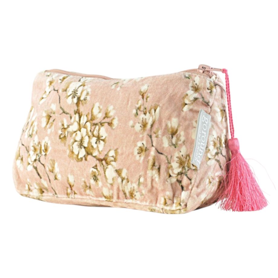 De Etui Anjer Large van het label Goround is een zachte etui, van viscose fluweel, en heeft een bloesemprint. De binnenkant van het etui is gemaakt van naturelkleurige katoen. Aan de rits hangt een spectaculair zijde achtig kwastje in knalroze. Deze etui is een vrolijke en praktische accessoire om al je  spullen in op te bergen. Hij is is eigenlijk je PA, hij bergt alles voor je op – en superleuk om cadeau te geven!