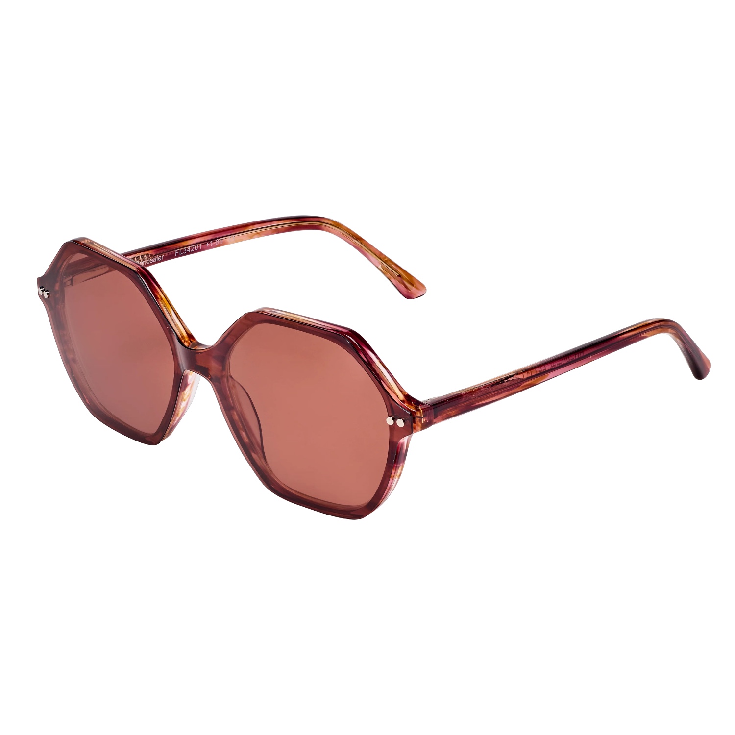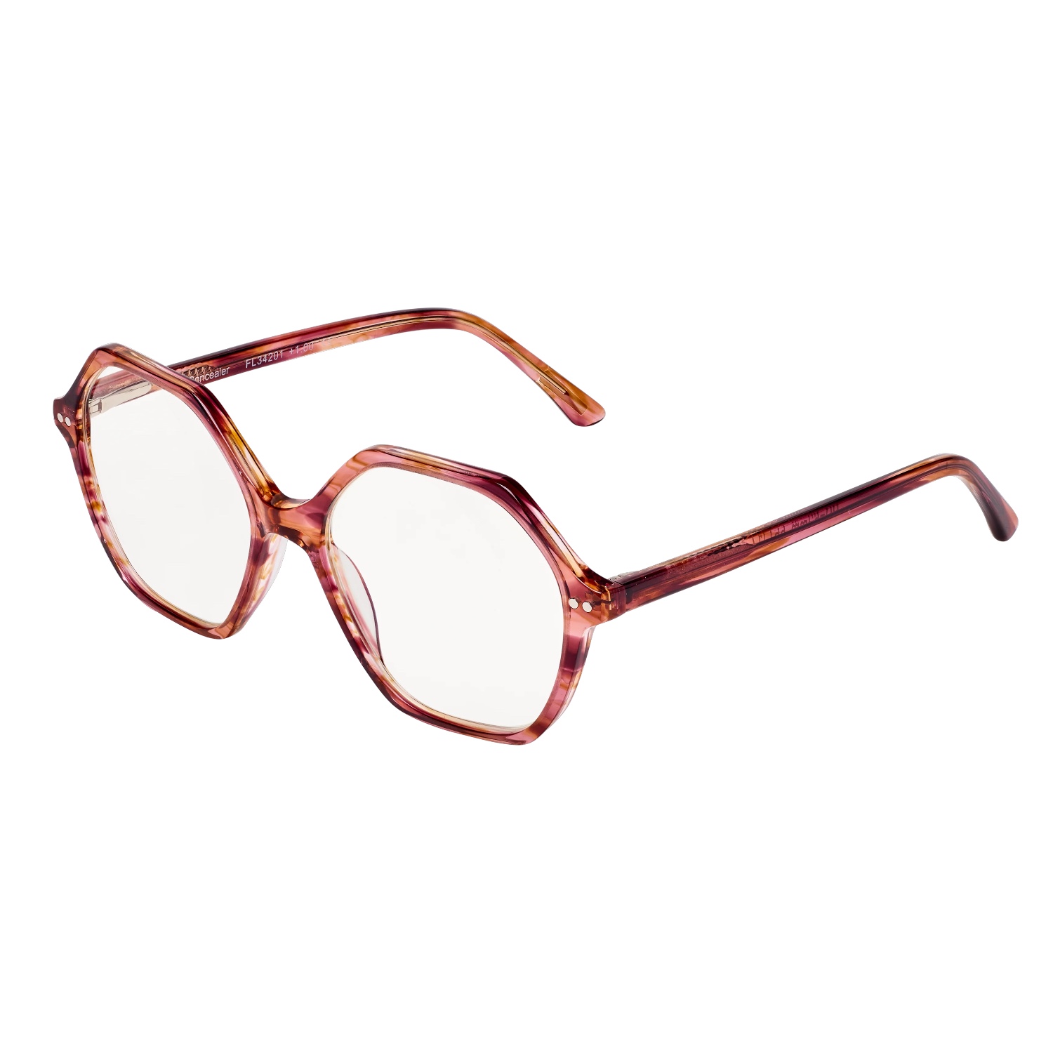 Het montuur heeft een elegante, licht hoekige vorm die een modern en verfijnd karakter geeft. De warme kleur, een mix van roodachtige en bruine tinten, zorgt voor een stijlvolle uitstraling met een subtiel modieus accent. Daardoor past deze bril moeiteloos bij zowel casual outfits als meer geklede looks. Het montuur is gemaakt van hoogwaardig acetaat, wat niet alleen duurzaam is, maar ook licht en comfortabel draagt.