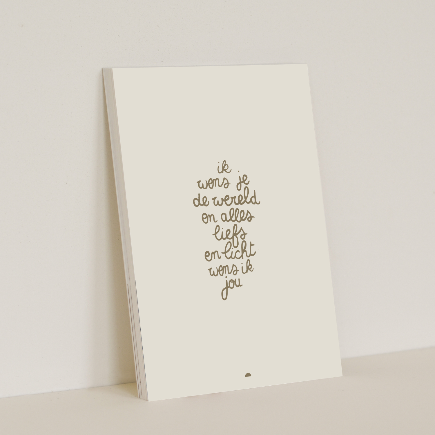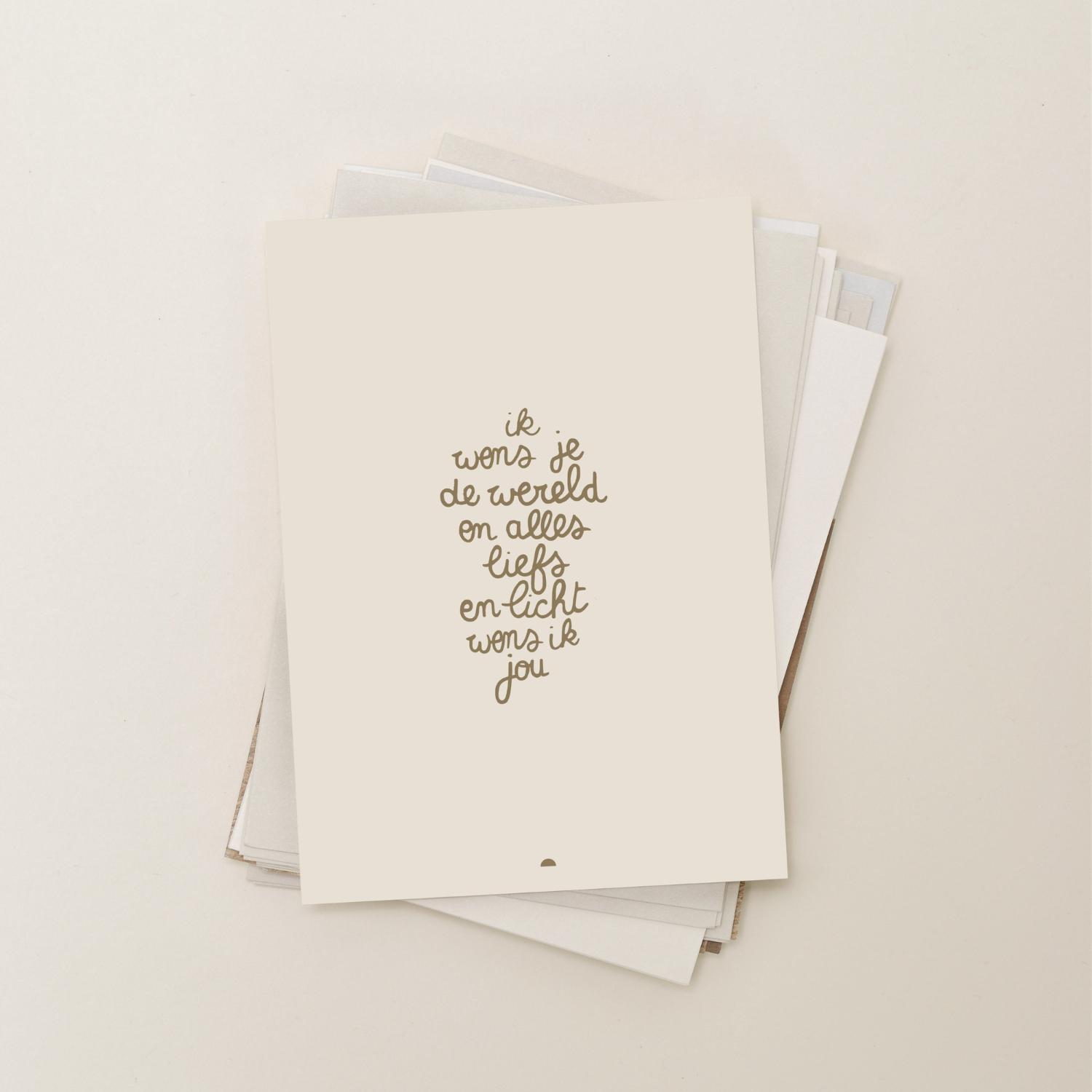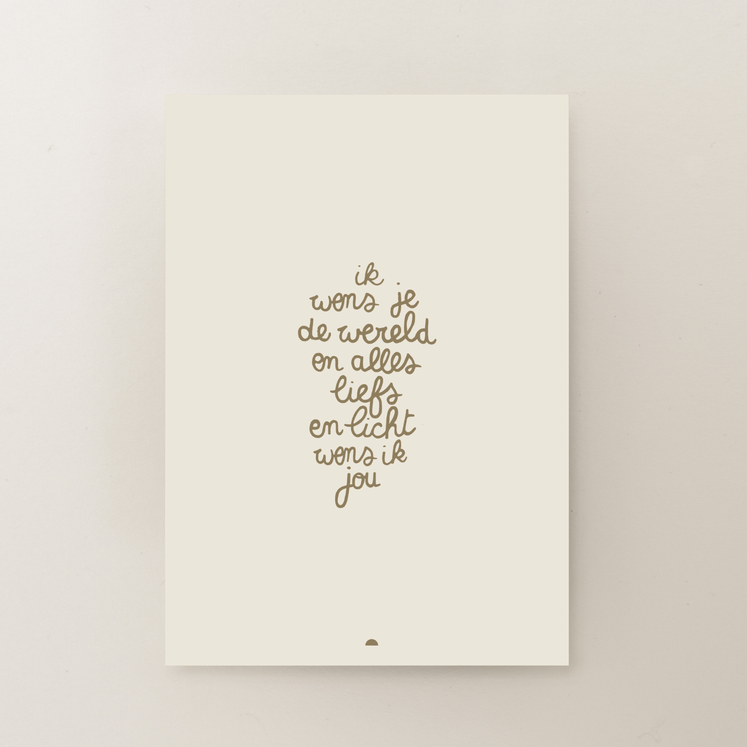 De wenskaart Ik wens je is een minimalistische, tijdloze kaart met een warme boodschap. Op de voorkant staat in sierlijke handgeschreven letters: “ik wens je de wereld en alles liefs en licht wens ik jou”. Deze kaart straalt eenvoud en liefde uit en is daardoor perfect geschikt om iemand een hart onder de riem te steken. Of om een verjaardag extra bijzonder te maken of zomaar een glimlach te bezorgen.
