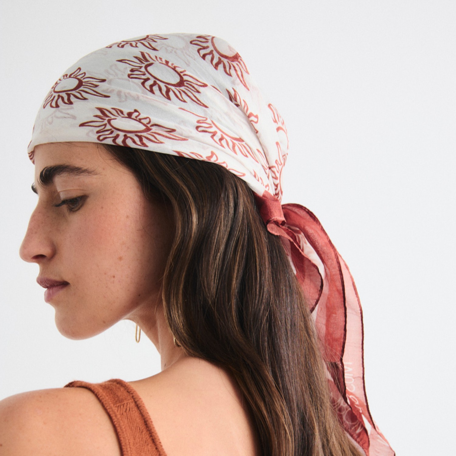 De warme rood bruine tint in combinatie met de subtiele print zorgt voor een klassieke en veelzijdige look. Draag de Kinic Scarf losjes om de hals, geknoopt in het haar of stijlvol aan je tas voor een speelse, modieuze touch. Dankzij het zijde materiaal voelt de sjaal luxueus aan en valt hij soepel en elegant.