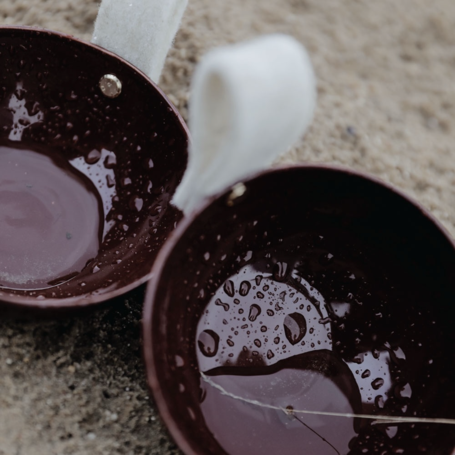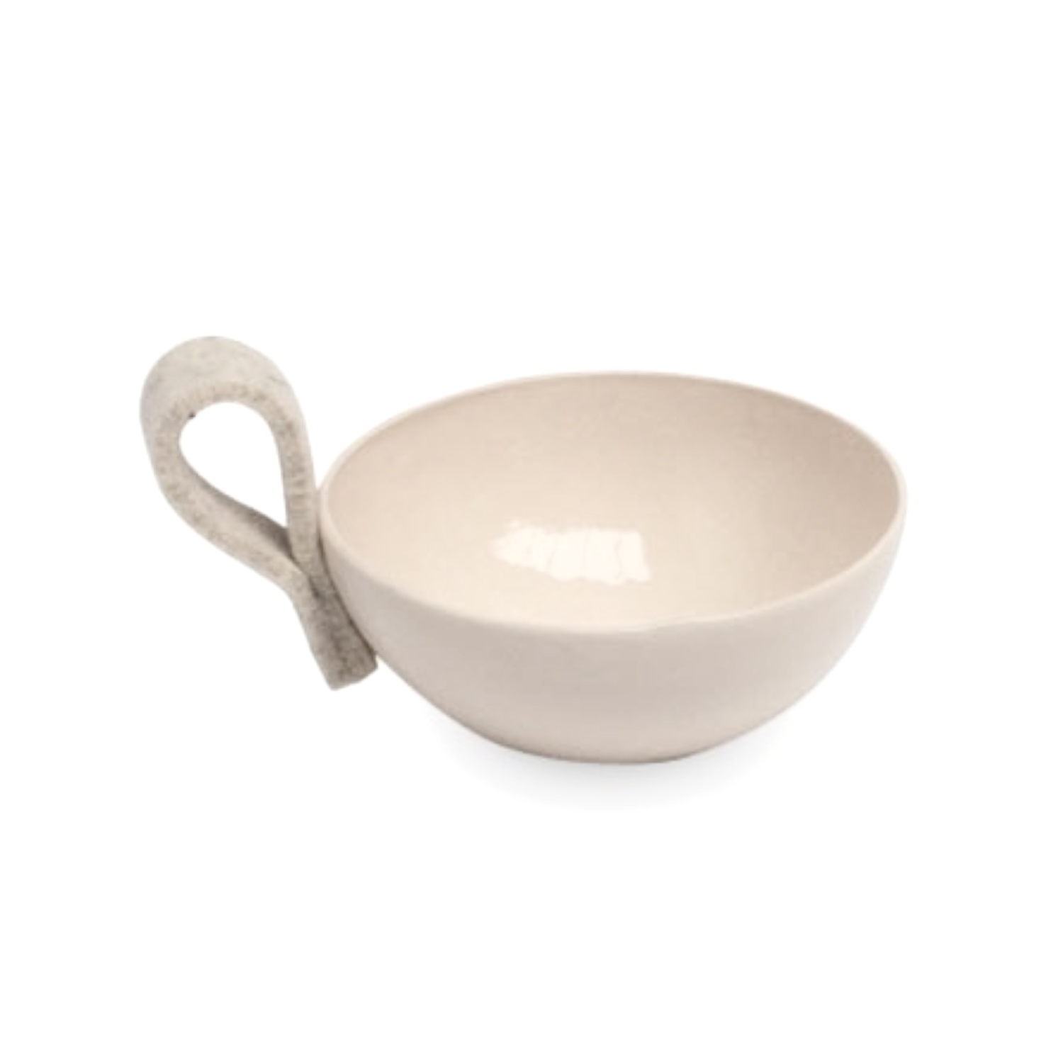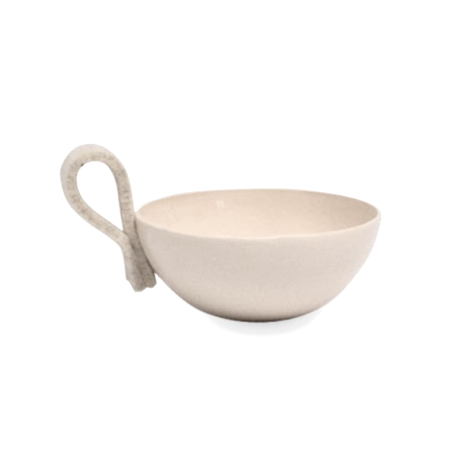 Een enkele vilten lus aan de rand voegt een verrassend zacht accent toe. Deze tactiele toevoeging contrasteert subtiel met het gladde keramiek en verwijst naar traditioneel handwerk, wat het kommetje een warme, ambachtelijke uitstraling geeft.
