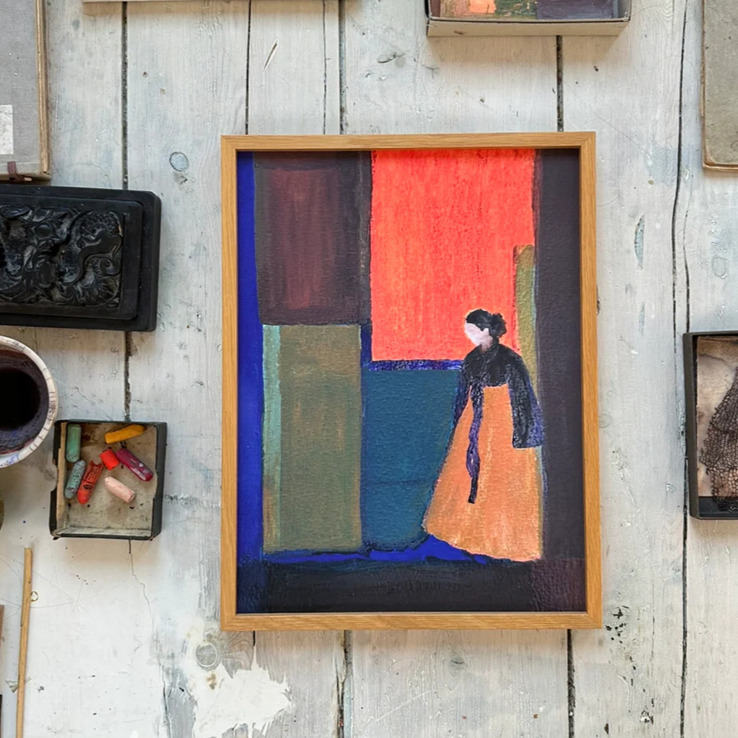 Dit kunstwerk van Tinystories vangt de serene elegantie van de traditionele Koreaanse hanbok in een moderne, abstracte compositie. Het gebruik van heldere kleurvlakken in diepblauw, oranje en rood contrasteert prachtig met de ingetogen figuur, waardoor een tijdloze balans tussen traditie en hedendaagse kunst ontstaat.