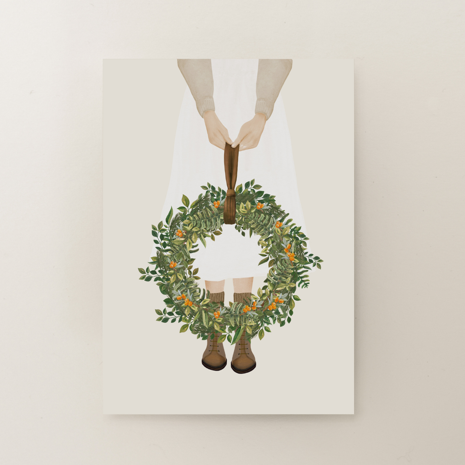 De wenskaart Krans Light van Sâlt + Flor ademt de sfeer van warmte en feestelijkheid. De illustratie toont een persoon die een groene krans met oranje accenten vasthoudt, zorgvuldig vastgebonden met een bruin lint. Het beeld straalt eenvoud en sereniteit uit en symboliseert zowel verbondenheid als de schoonheid van het seizoen.