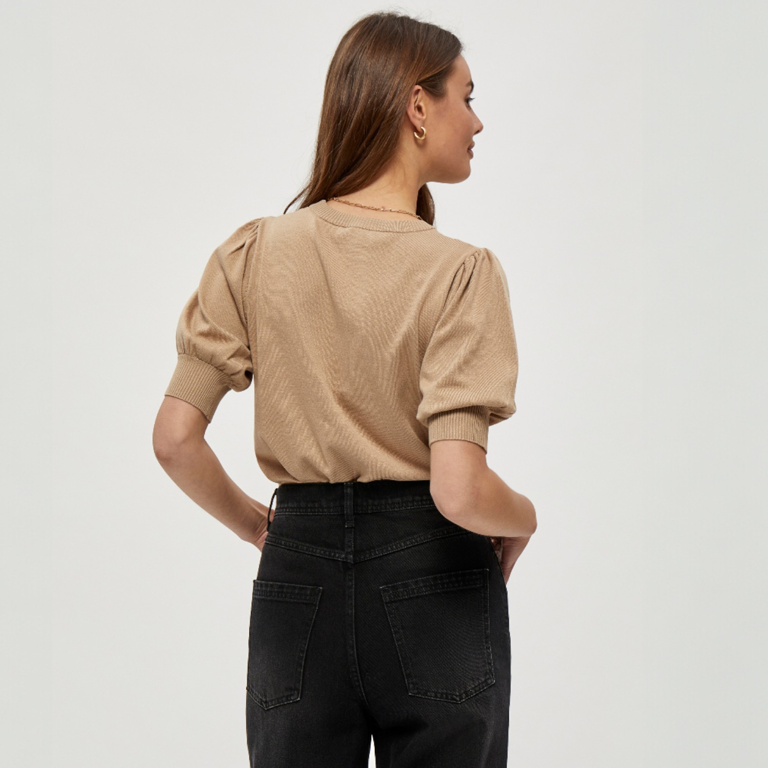 Wat deze zandkleurige dames top extra aantrekkelijk maakt, is de veelzijdigheid. De subtiele structuur en nette pasvorm zorgen ervoor dat je hem moeiteloos combineert met denim, linnen broeken of een mooie rok. Draag hem solo voor een clean, elegante look, of style hem onder een blazer voor een meer geklede outfit. De lichte knitkwaliteit maakt dit item perfect voor wisselende seizoenen: luchtig genoeg voor de lente, maar ook ideaal als laagje op koelere dagen.