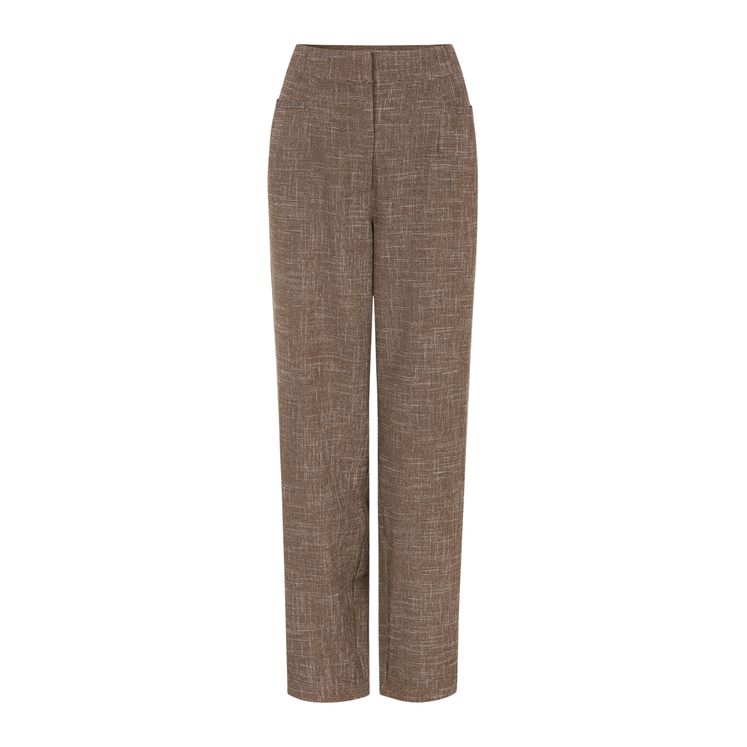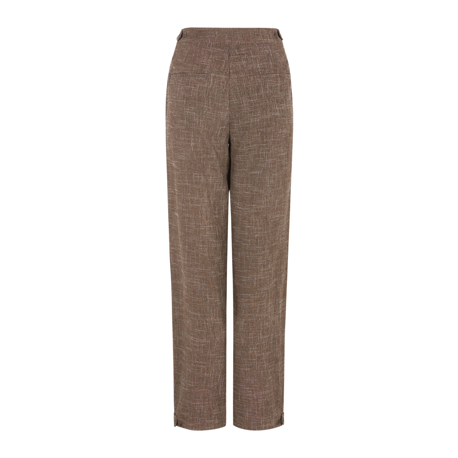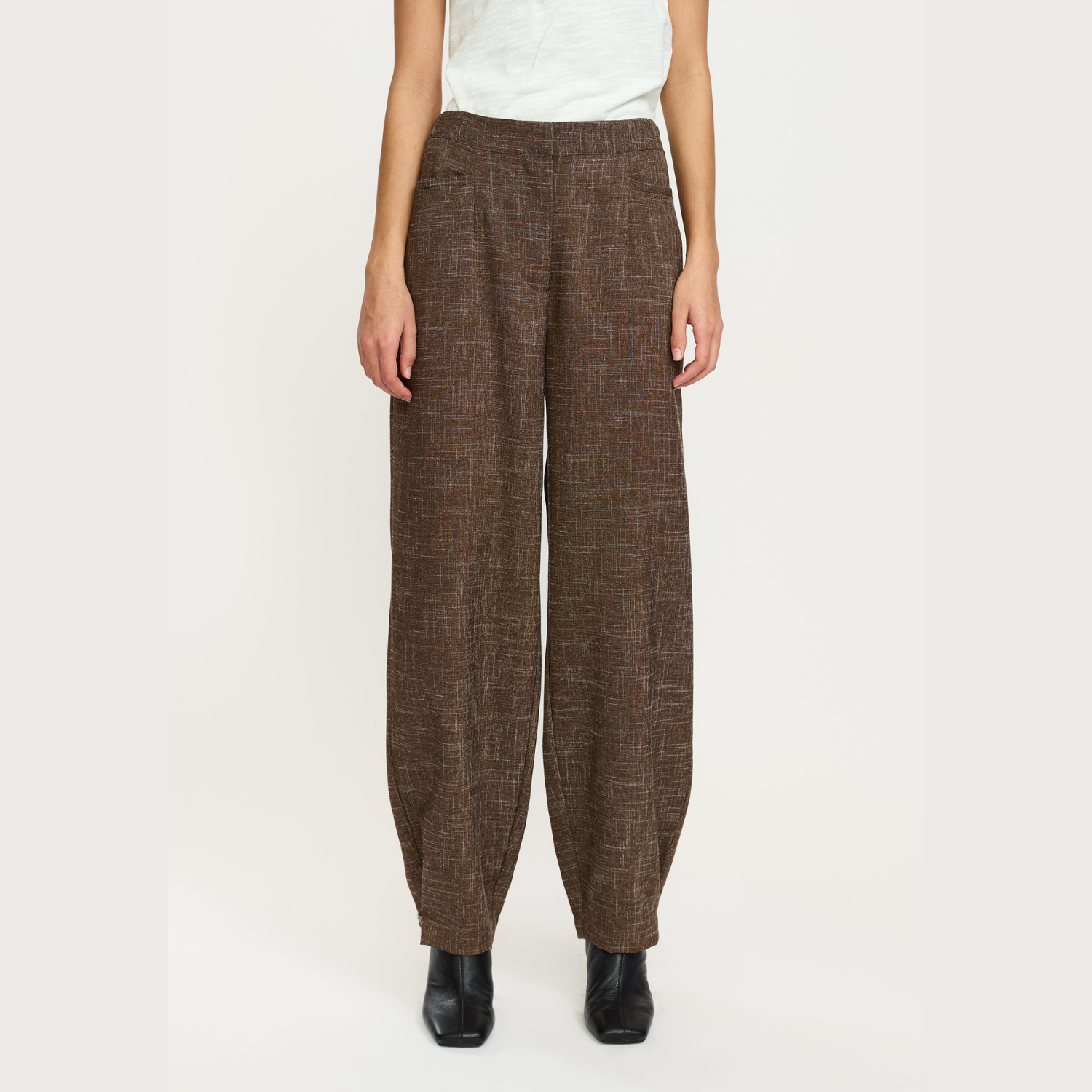 De gemêleerde stof geeft de broek een zachte diepte in kleur, waardoor sepia niet vlak oogt maar juist levendig en warm. Daarom laat dit ontwerp zich moeiteloos combineren met zowel lichte tinten als diepere aardekleuren. Bovendien versterken de subtiele textuur en de rustige belijning het tijdloze karakter van de broek.