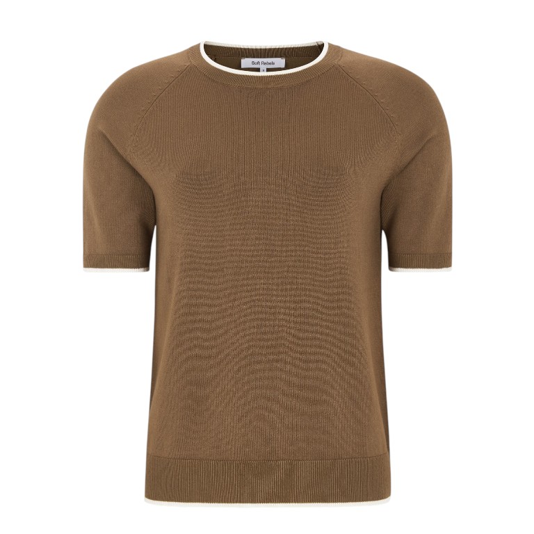 De Marla SS Contrast Knit Bison van Soft Rebels is een stijlvolle fijngebreide top met een moderne en tijdloze uitstraling. De warme bisonkleur vormt de basis van het ontwerp, terwijl de subtiele contrastdetails zorgen voor een speelse en verfijnde touch.