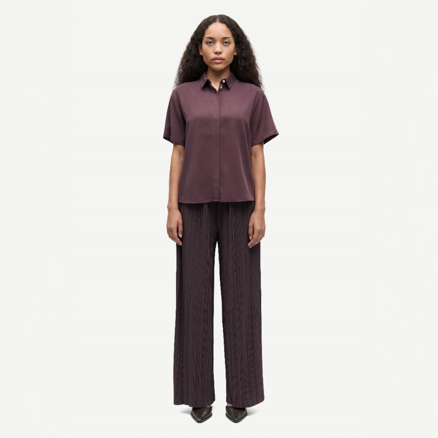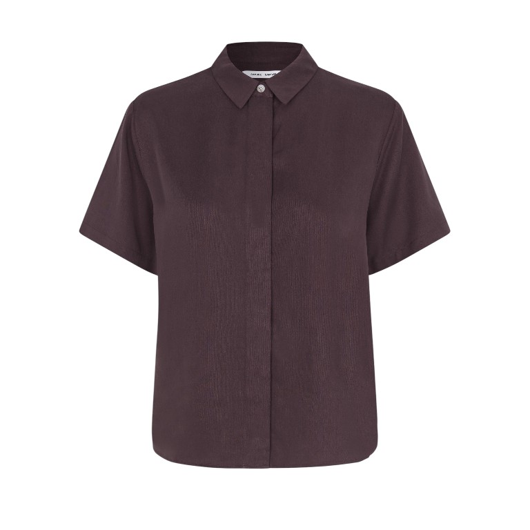 De bruine damesblouse met korte mouwen, de Mina SS Shirt Fudge van Samsoe Samsoe, is een stijlvolle keuze die eenvoud en klasse combineert. De diepe Fudge-kleur geeft de blouse een rijke, verfijnde uitstraling die perfect past bij zowel zakelijke als casual looks.