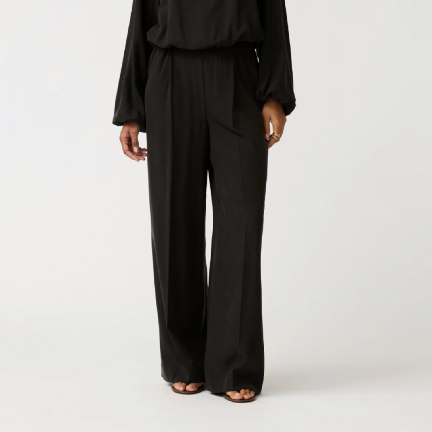 Dankzij de elastische taille draagt de broek zeer comfortabel en sluit hij mooi aan zonder strak te zitten. De wijde pijpen vallen soepel langs het been en geven het silhouet een moderne, luchtige lijn. Bovendien maakt de effen zwarte tint dit item gemakkelijk te combineren met zowel basics als knitwear. Daarom is dit model geschikt voor dagelijks gebruik, maar ook voor meer geklede combinaties.
