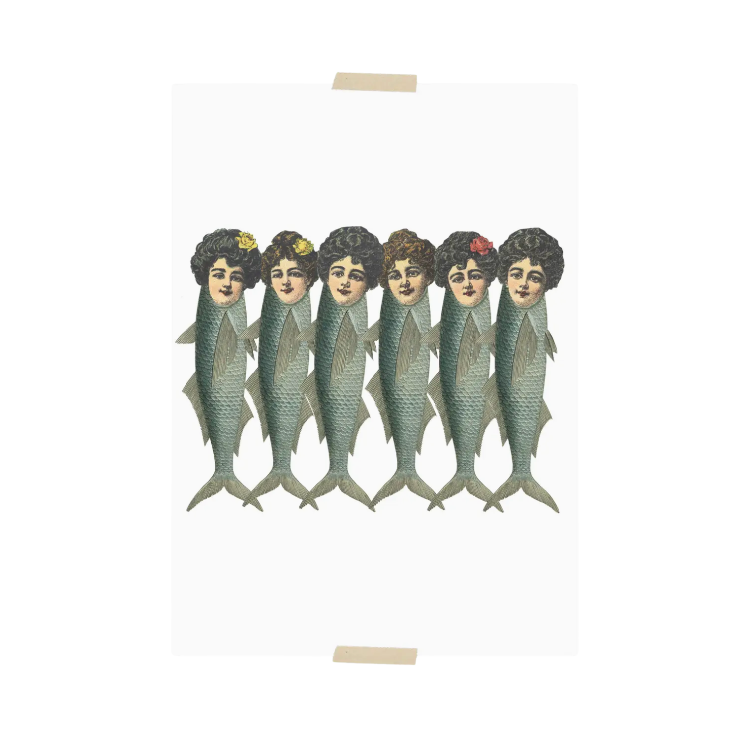 Dit is een speelse en surrealistische kaart van het merk Lylies. Op de kaart staan zes elegante dameshoofden gecombineerd met het lichaam van een vis – een charmante collage die meteen de aandacht trekt. De combinatie van vintage portretillustraties en sierlijke visvormen geeft het ontwerp een licht absurdistische en kunstzinnige uitstraling. Daardoor voelt deze kaart tegelijk nostalgisch, humoristisch en verfijnd.