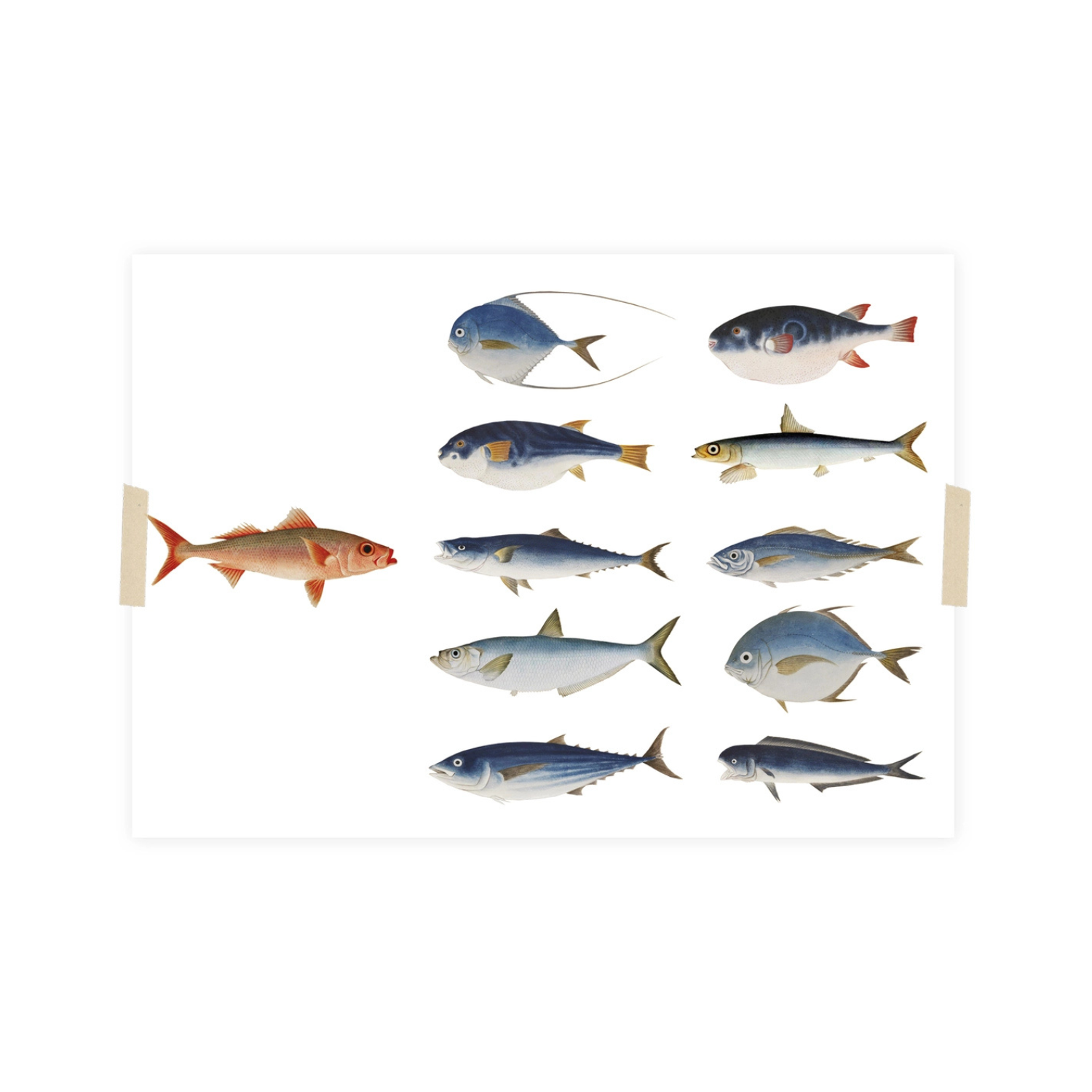 Vrolijke ansichtkaart The Parade van Naturalis, met een collage vervaardigd uit tekeningen van Kawahara Keiga en Ishizaki Yushi uit de Naturalis-collectie (1786-1860).