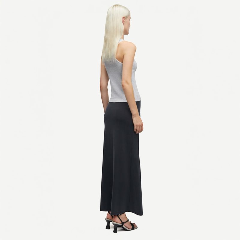 Het Sasus Skirt in de kleur Black, van het label Samsoe Samsoe, is een prachtige lange rok. Deze rok heeft een minimalistisch en elegant silhouet met een subtiele A-lijn. De zachte stof valt soepel om het lichaam en de asymmetrische belijning aan de voorzijde geeft het ontwerp een frisse twist. Kortom een veelzijdige item dat moeiteloos combineert met zowel een meer casual knit als een verfijnde blouse of top.