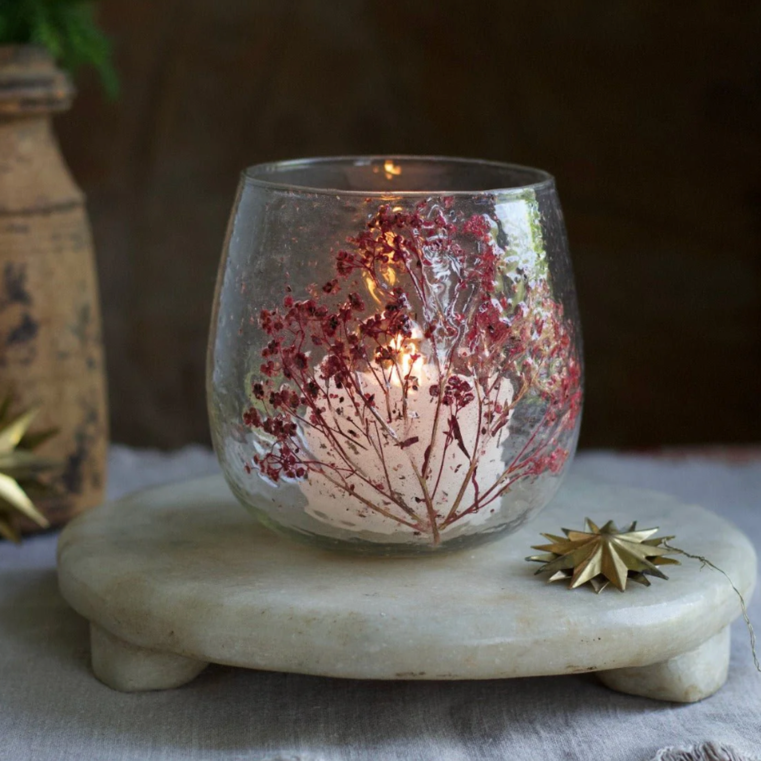 Grote glazen waxinelichthouder rode bloemen is een betoverend woonaccessoire dat warmte, licht en natuur samenbrengt. Deze handgemaakte houder van De Weldaad is versierd met ingesloten rode bloemetjes, die prachtig oplichten zodra er kaarsjes in branden. Door het zachte, transparante glas ontstaat een sfeervol spel van licht en kleur dat elke ruimte tot leven brengt.