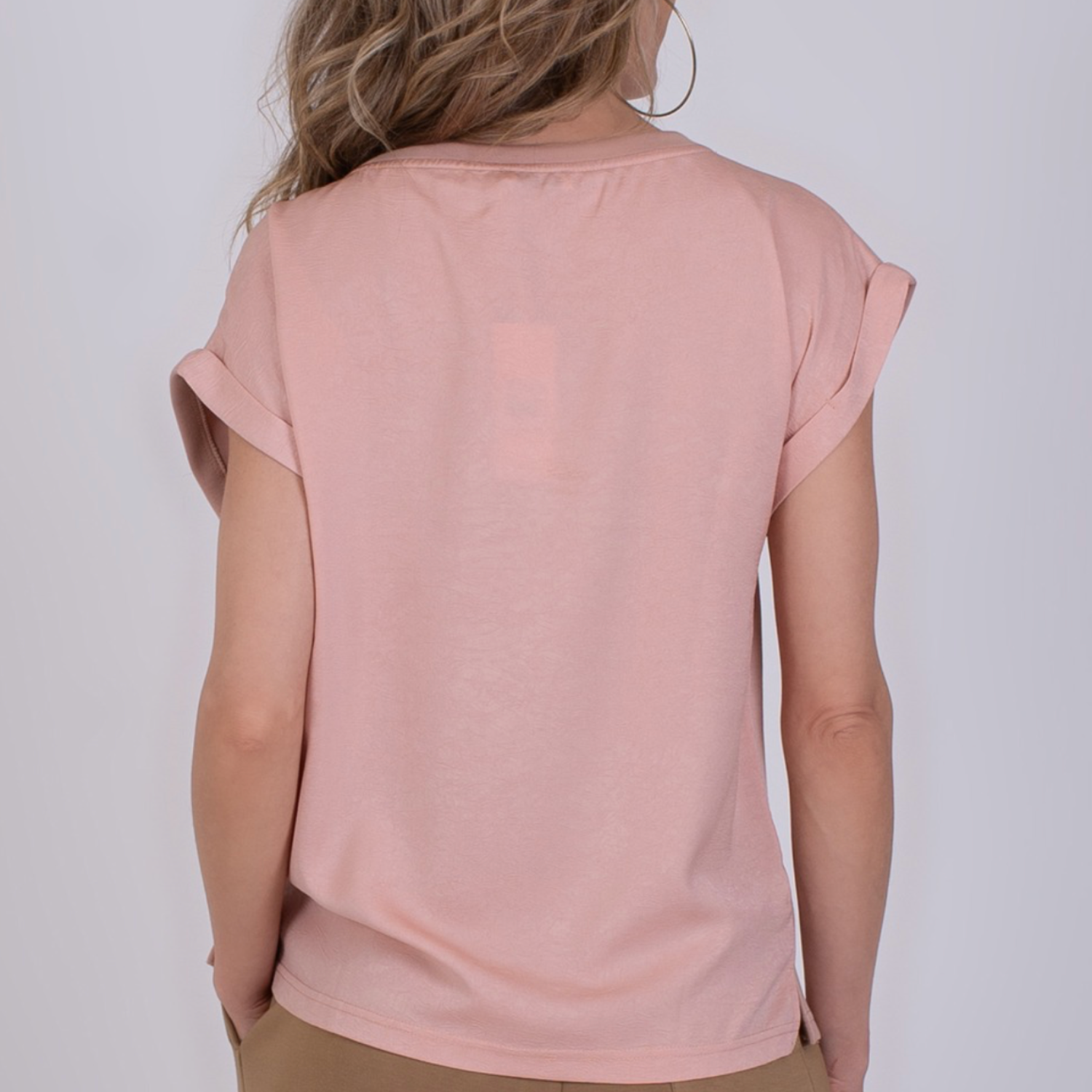 De relaxte pasvorm geeft het shirt een moderne, nonchalante uitstraling. Bovendien zorgen de omgeslagen mouwen en de minimalistische afwerking voor een verfijnd detail, zonder dat het te opvallend wordt. Daarom kun je dit T-shirt eindeloos combineren: draag het casual met een jeans of combineer het met een rok of pantalon voor een meer geklede look. De oudroze tint voegt warmte toe aan je outfit en laat zich prachtig combineren met neutrale kleuren en zachte aardetinten.