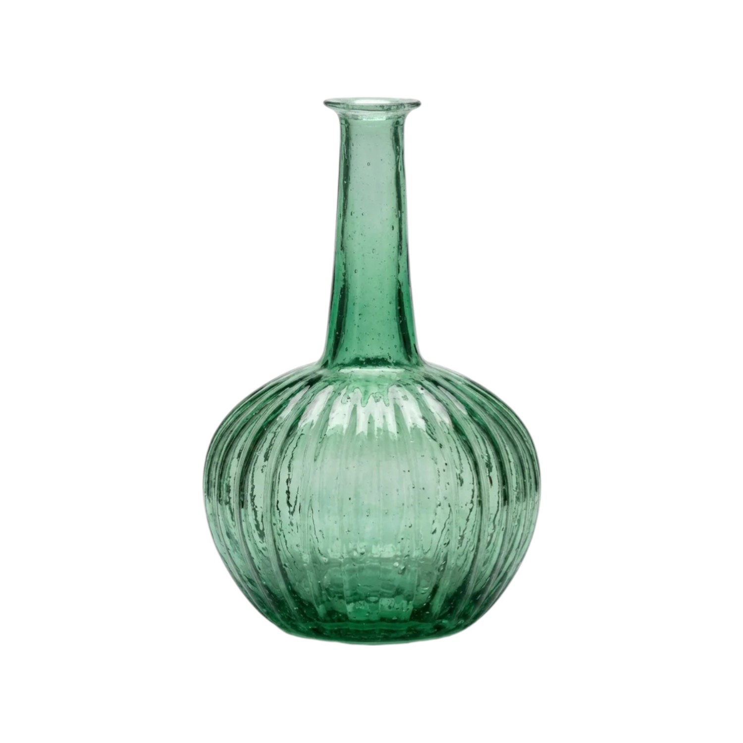 Het tastbare oppervlak vangt het licht prachtig en zorgt voor een levendige schittering. De vorm doet denken aan vintage parfumflesjes of traditioneel apothekersglas, maar dan uitgevoerd in een frisse pistachegroene tint.